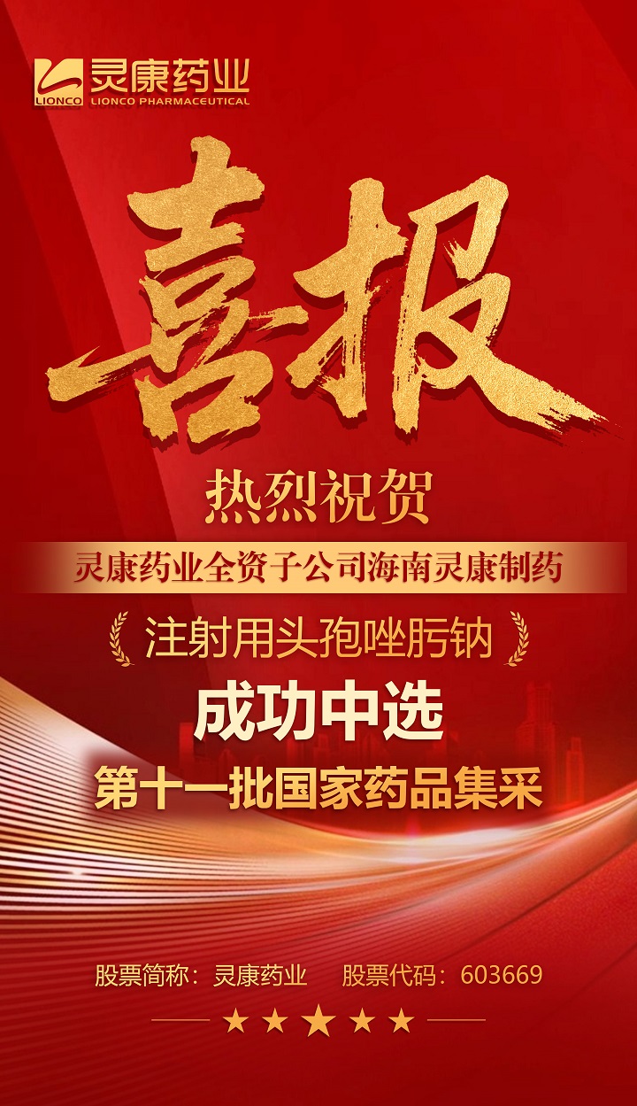 灵康药业集团股份有限公司全资子公司海南灵康制药有限公司参加了国家组织药品联合采购办公室组织的第十一批全国药品集中采购工作,灵康制药产品注射用头孢唑肟钠成功中选此次集中采购。