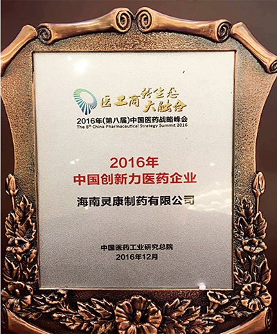 海南灵康制药有限公司荣获“2016 年中国创新力医药企业”称号