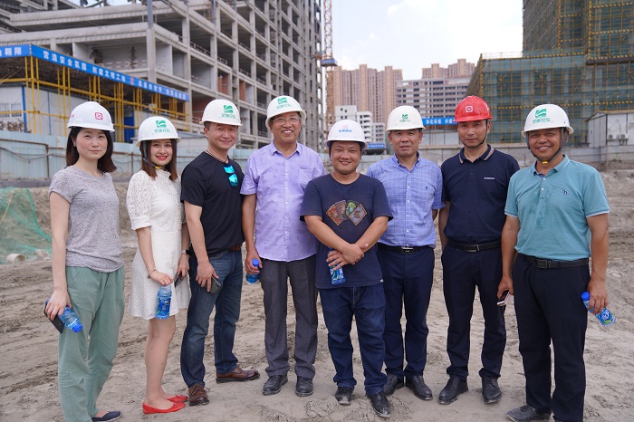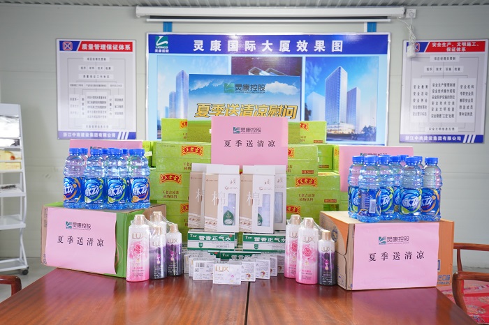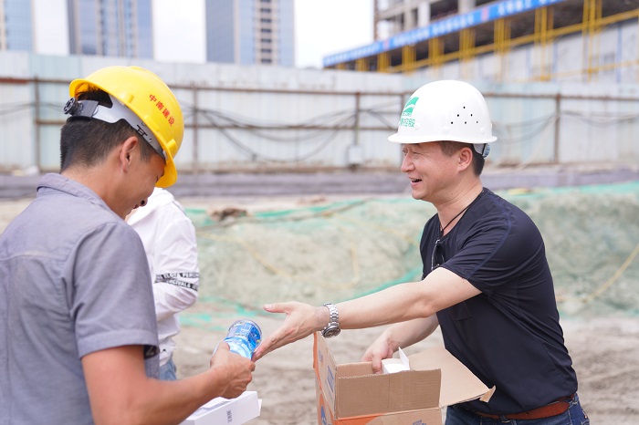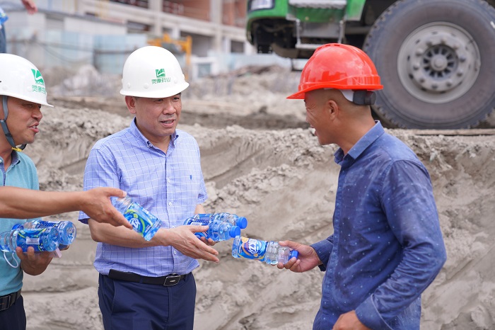 入伏以来、连日高温,灵康国际大厦项目施工现场温度一度升至40摄氏度以上。集团董事长陶灵萍时刻牵挂奋战在项目建设一线的员工及建筑工人,对高温条件下项目施工进展情况提出明确要求,并专门安排了一线慰问送清凉活动。7月26日下午,灵康控股集团副总裁蒋建中、副总裁杨栋、总工程师陶禄缘等,来到项目施工现场,慰问一线工作人员。