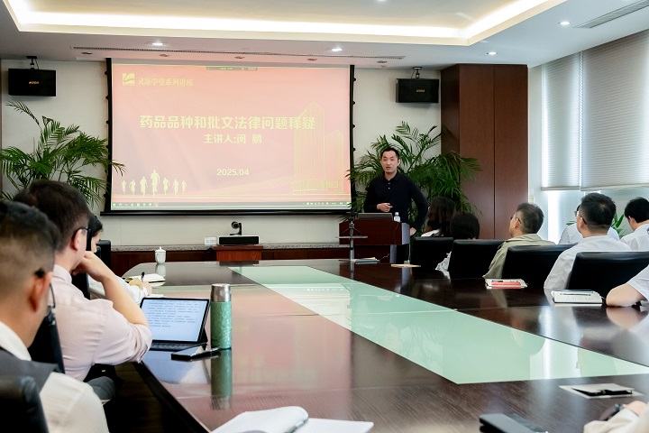 2025年4月28日,灵康药业集团杭州总部成功举办新一期灵康学堂系列讲座。本期主题聚焦《药品品种与批文法律实务精解》,特邀东方华银律师事务所合伙人、医药领域资深法律专家闵鹏担任主讲。讲座采取"线下会场+线上直播"模式,集团总部中高层管理人员,销售管理中心、研发管理中心骨干成员等现场参会,全国各子公司近百名员工通过视频会议系统同步学习。